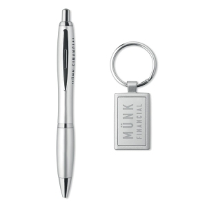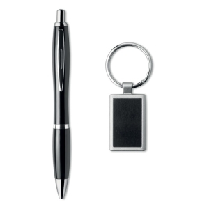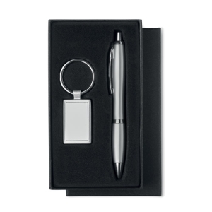 2-częściowy zestaw upominkowy w pudełku. Zawiera metalowy wykręcany długopis z detalami z poliestru RPET i brelok z poliestru RPET. Niebieski tusz.