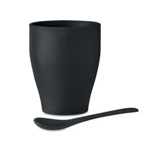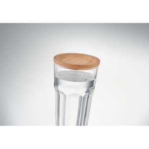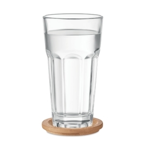 Zestaw wysokich, borosilikatowych szklanek z podwójnymi ściankami z bambusową pokrywką, z silikonowym pierścieniem. Pojemność 350 ml.