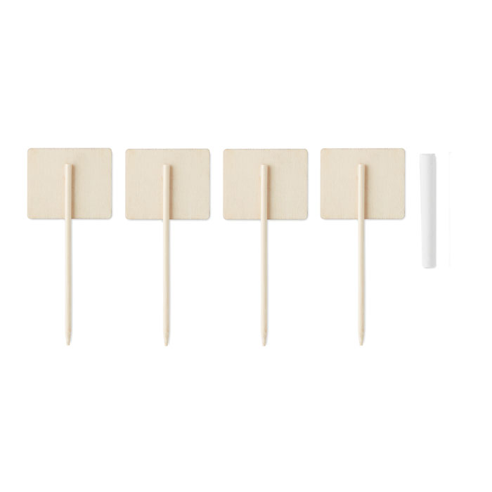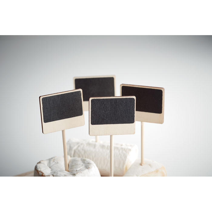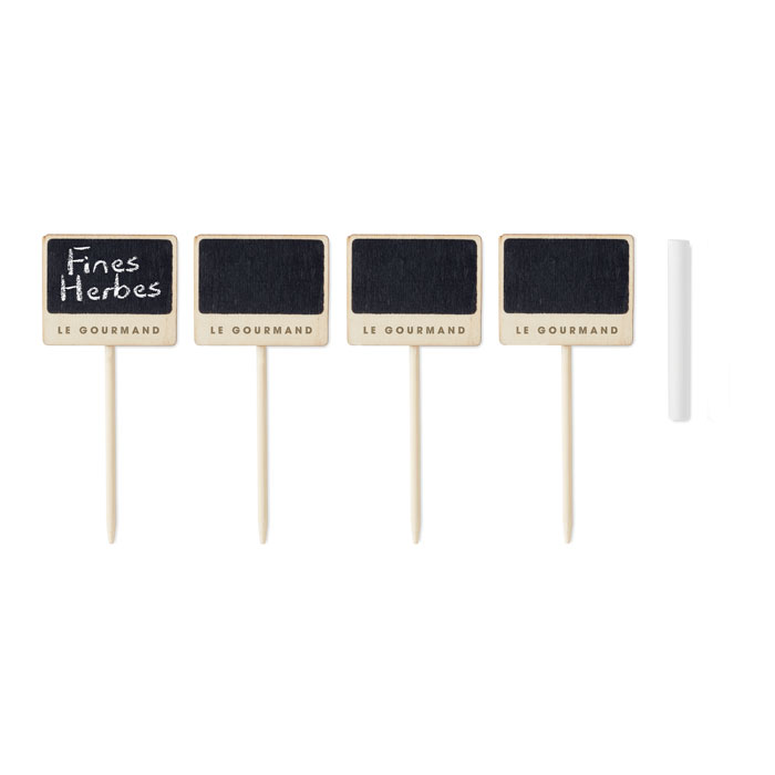 Zestaw 4 tabliczek do opisania przystawek z MDF z kredą. W pudełku z papieru kraft.
