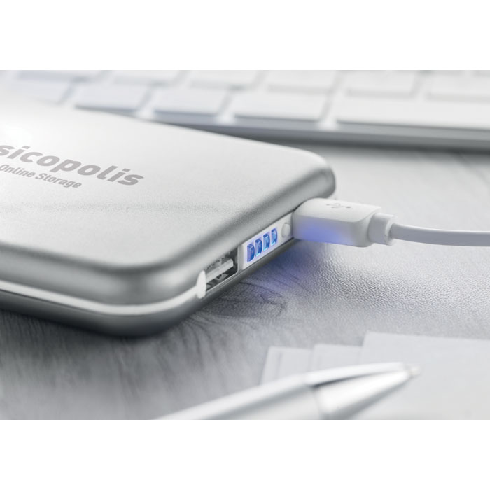 Aluminiowy Power bank 4000 mAh z panelem solarnym. Pojemność pozwala na ładowanie smartfonów. Dane wyjściowe: DC5V/1A. Wyposażony w diodę oraz kabel USB z wtyczką micro usb. Funkcja ładowania słonecznego została zaprojektowana do awaryjnych sytuacji. Ładowanie solarne jest mniej wydajne niż ładowanie poprzez USB.