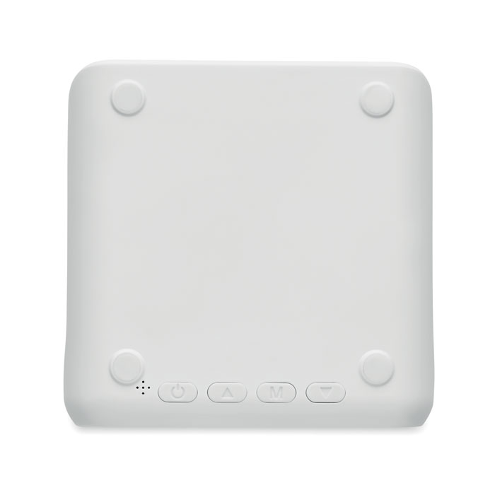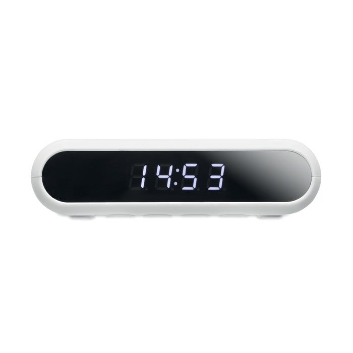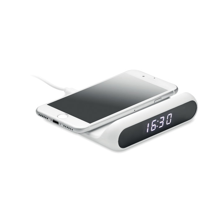 Ładowarka bezprzewodowa 10W z budzikiem z białymi diodami LED, w obudowie z tworzywa ABS. Zawiera kabel USB do ładowania typu C. Wyjście: DC 9V/1,10A (10W) do szybkiego ładowania. Kompatybilna z najnowszymi telefonami Android, iPhone® 8, X i nowszymi.