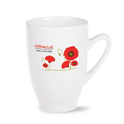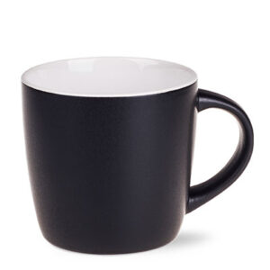 Smukły kubek o zaokrąglonych kształtach z uchwytem w kształcie połówki serca.