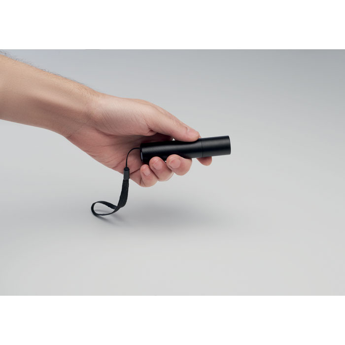 Aluminiowa latarka akumulatorowa o mocy 110 lumenów z 3 ustawieniami światła i funkcją przybliżania/oddalania. Wbudowany akumulator 400 mAh i kabel do ładowania w zestawie.
