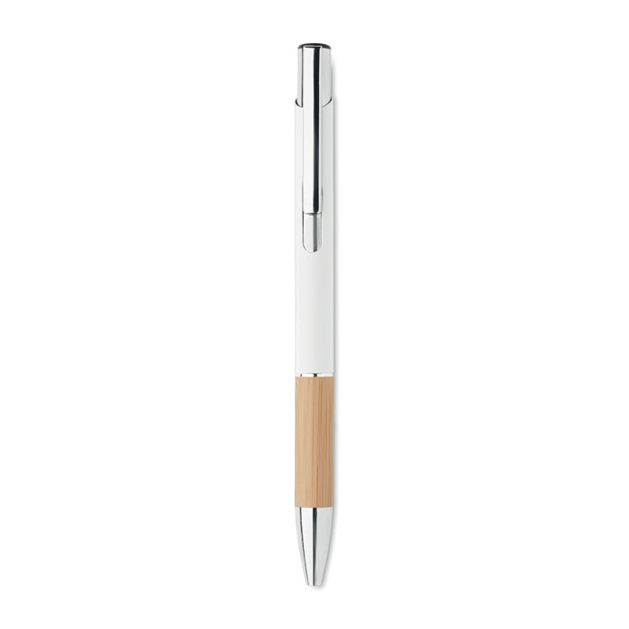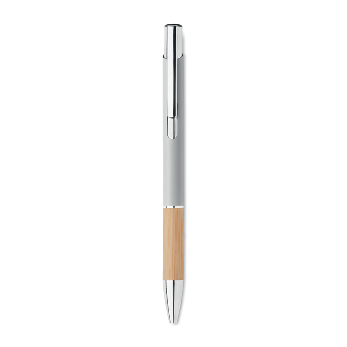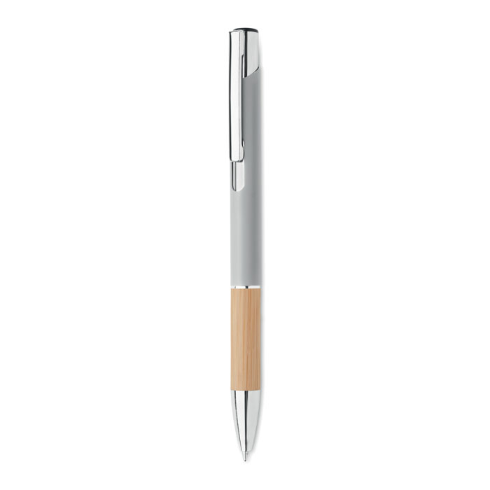Przyciskany długopis z aluminium z bambusowym uchwytem. Niebieski tusz.