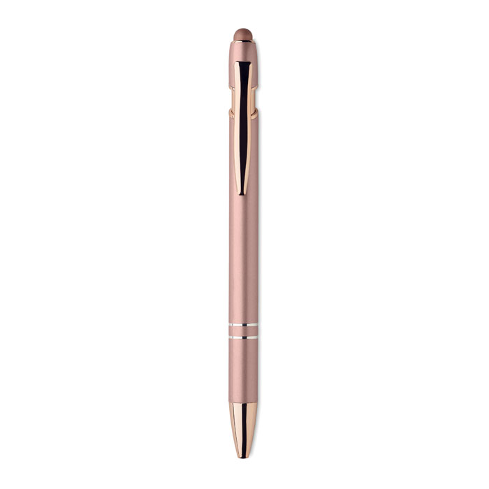 Długopis z recyklingowanego aluminium z detalami w kolorze różowego złota. Niebieski tusz.