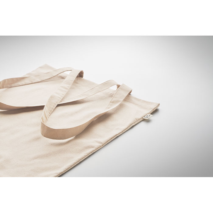Bawełniana torba na zakupy z prekonsumenckiego recyklingu (70% bawełny z recyklingu i 30% RPET) z długimi uchwytami. 140 gr/m².