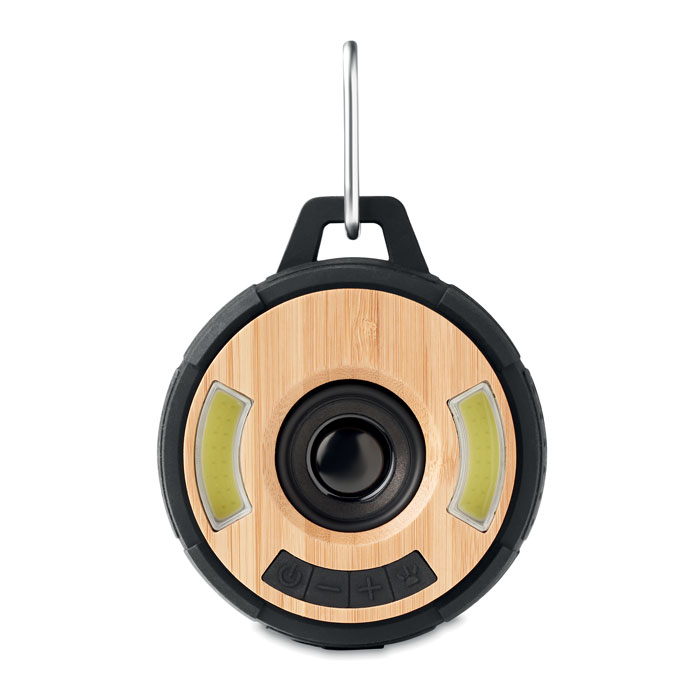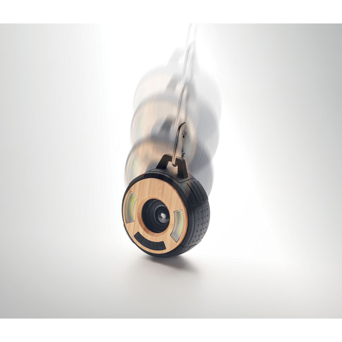 Bezprzewodowy głośnik 5.0 z bambusa i ABS, z 2 przednimi światłami COB, wodoodporny na zachlapania IPX4 i karabinkiem. 1 akumulator Li-Ion 500 mAh. Dane wyjściowe: 3W, 4 Ohm. Czas odtwarzania ok. 2h.