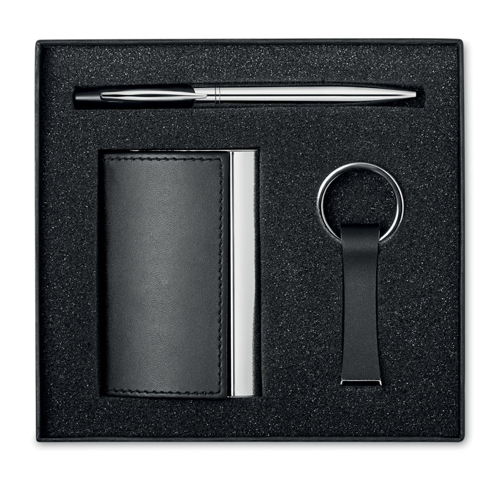 Biznesowy zestaw upominkowy zawierający przekręcany długopis ze stopu cynku, brelok z PU oraz wizytownik. Całość w pudełku. Czarny wkład w długopisie.