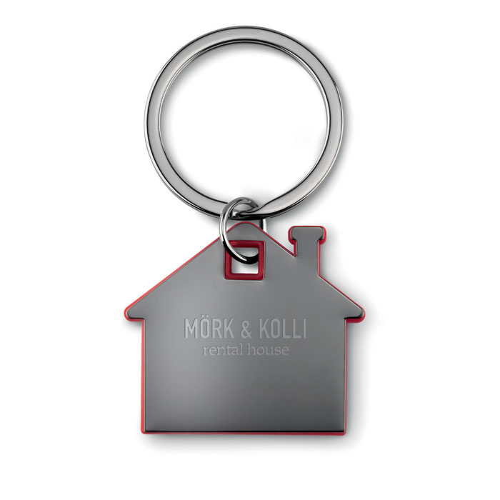 Brelok na klucze w kształcie domku, wykonany ze stali nierdzewnej oraz ABS.