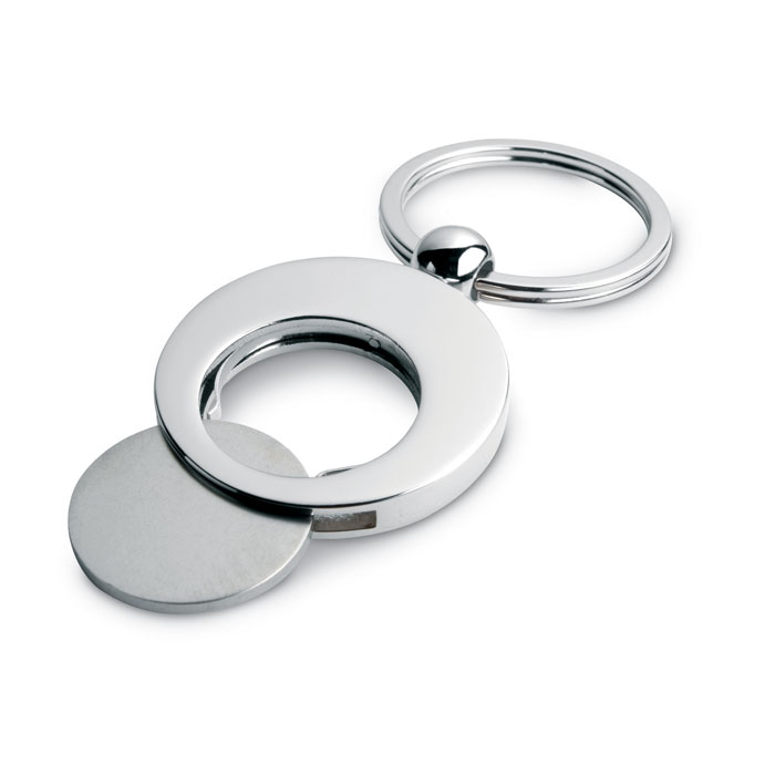 Okrągły brelok ze stopu cynku z żetonem do wózka sklepowego.