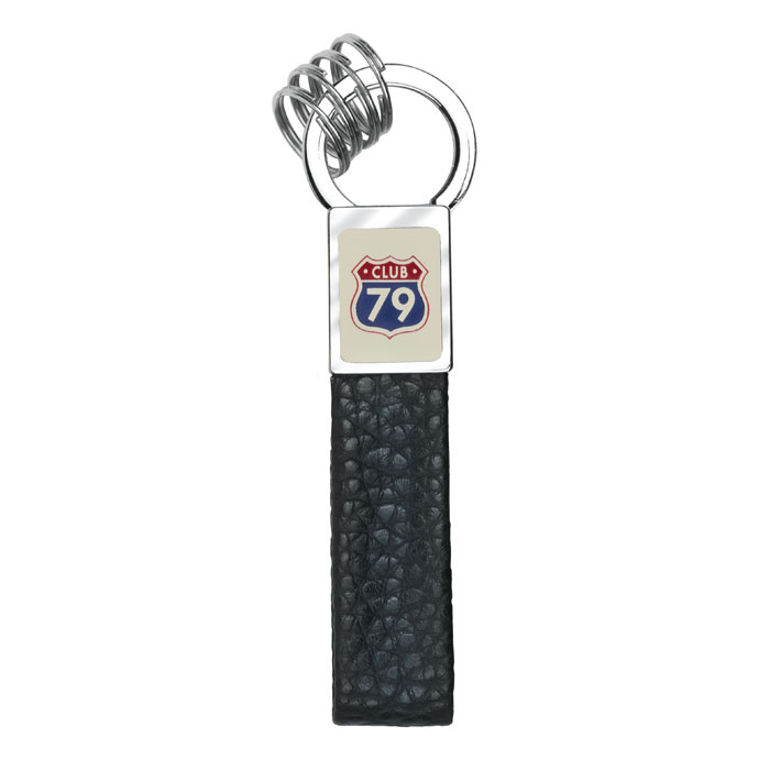 Brelok z wieloma kółkami i paskiem z PU. Błyszczące niklowane wykończenie.