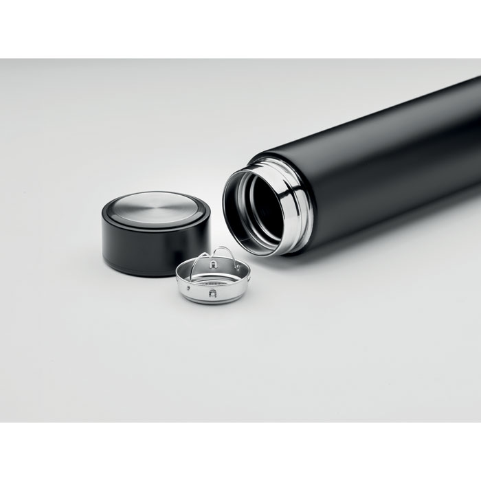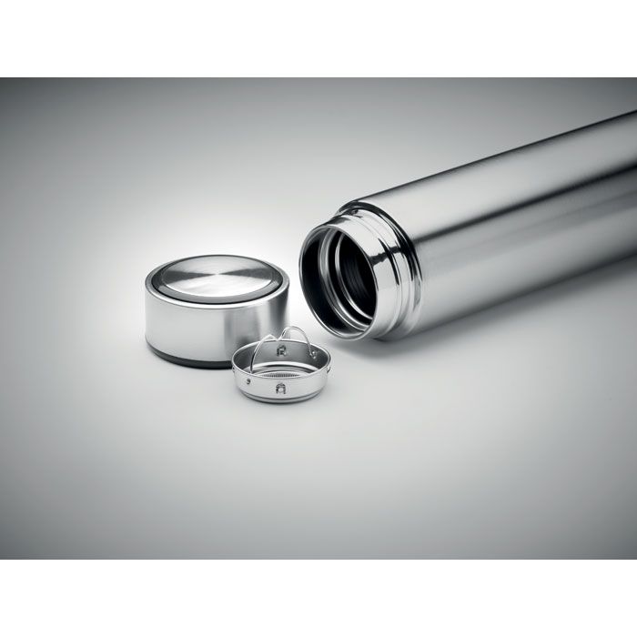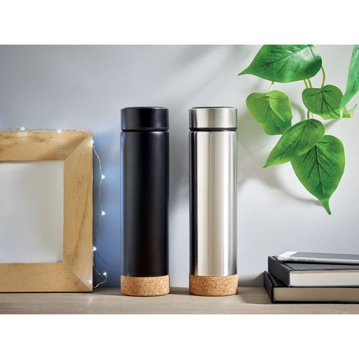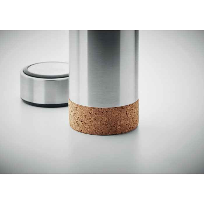Butelka ze stali nierdzewnej z podwójnymi ściankami, dodatkowym zaparzaczem i korkowym dnem. Pojemność 450 ml. Szczelna.