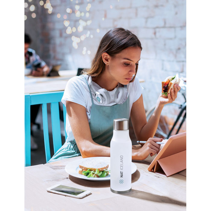 Butelka z RPET z gumowanym wykończeniem, zakrętka ze stali nierdzewnej z silikonowym pierścieniem. Bez BPA. Szczelna. Pojemność: 600 ml. Nie nadaje się do napojów gazowanych Szczelna.