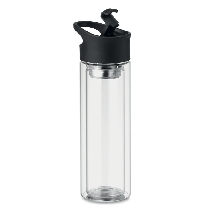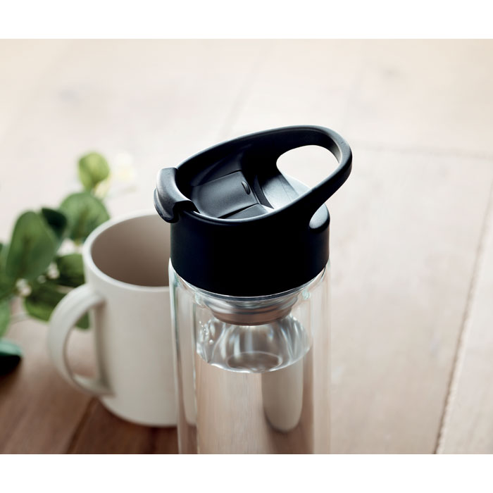 Butelka wykonana ze szkła z borokrzemianu, podsiada podwójne ścianki oraz pokrywkę z PP i zaparzacz do herbaty. Pojemność 380 ml. Szczelna. Grawerowanie laserowe nie jest możliwe na szkle borokrzemowym.