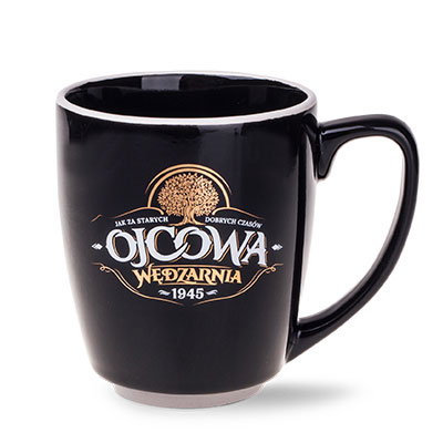 Pojemny, czarny kubek reklamowy o obłym kształcie z charakterystycznymi białymi wstawkami na rancie oraz w dolnej części. Duży uchwyt zapewnia wygodne trzymanie.