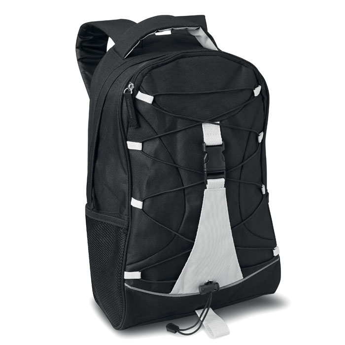 Czarny plecak z kolorową, kontrastową wkładką i dekoracyjną linką z przodu, boczne kieszenie z siatki. Wykonany z poliestru 600D.