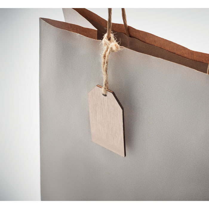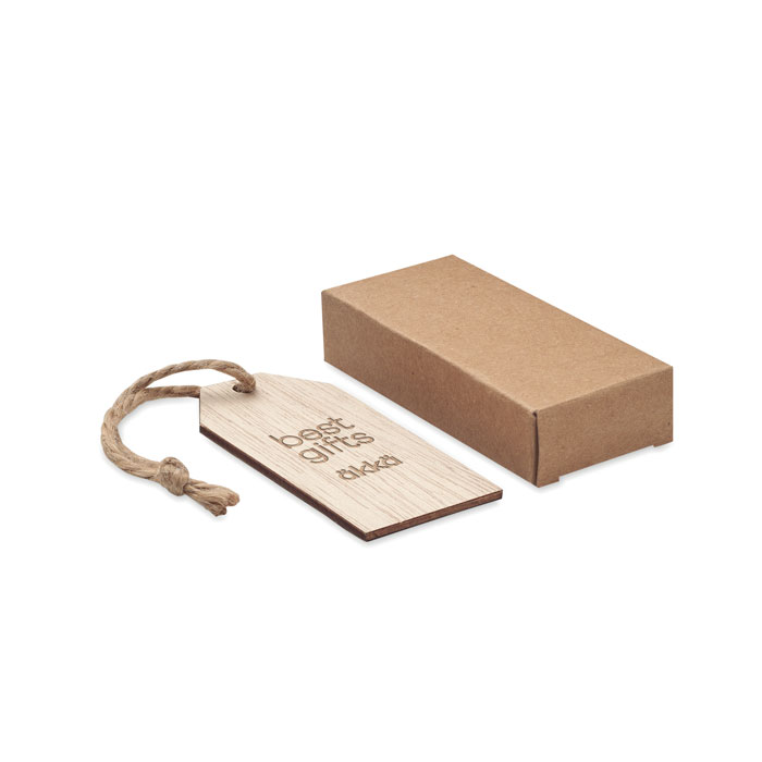 Zestaw 6 drewnianych zawieszek na prezenty z jutowym sznurkiem, w pudełku z tworzywa sztucznego.
