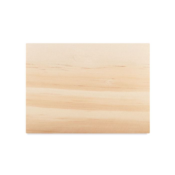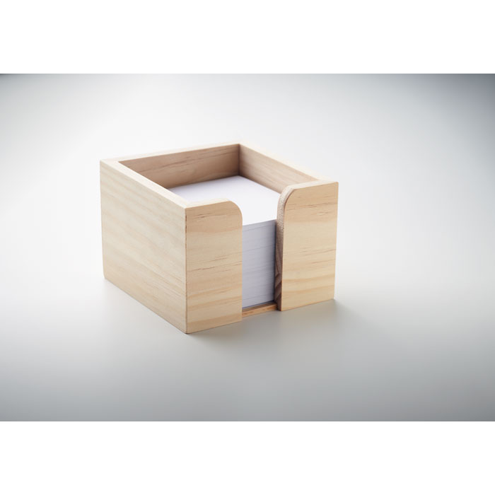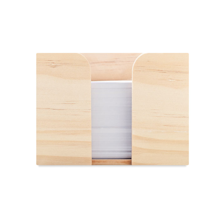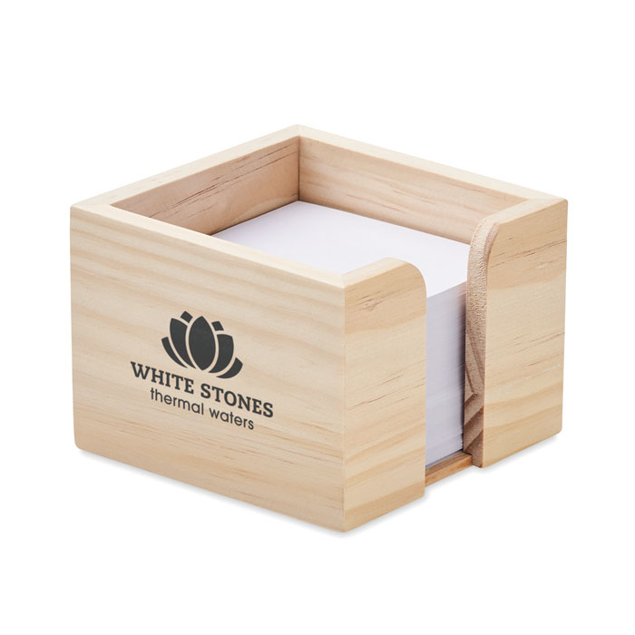 Pojemnik na kartki memo wykonany z drewna. 600 białych kartek o gramaturze 70 gr/m². Rozmiar 9×9 cm.