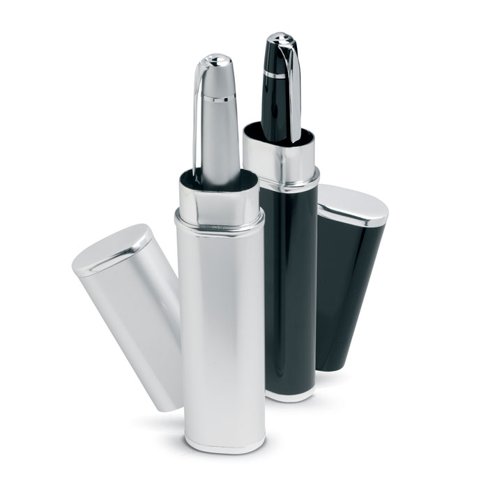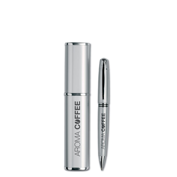 Metalowy przekręcany długopis w aluminiowym pudełku. Metalowy wkład z czarnym tuszem.