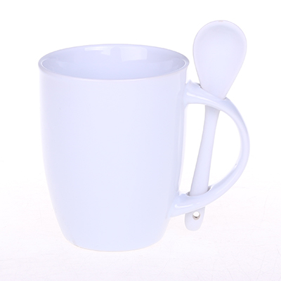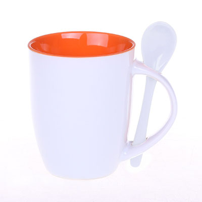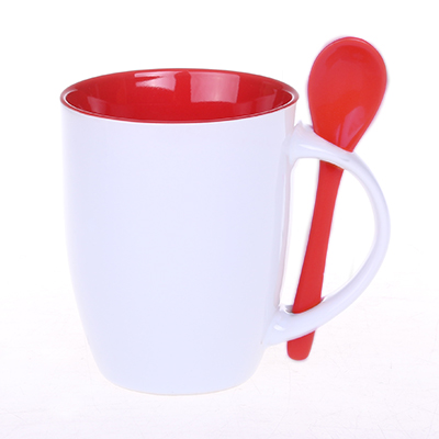 Kubek reklamowy z kolorowym wnętrzem i białym szkliwem na zewnątrz. W zestawie ceramiczna łyżeczka. Unikatowy kształt uchwytu ułatwia przechowywanie łyżeczki.