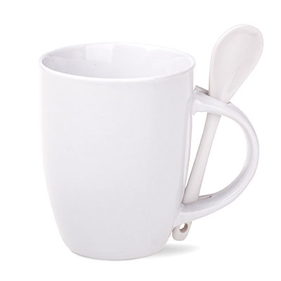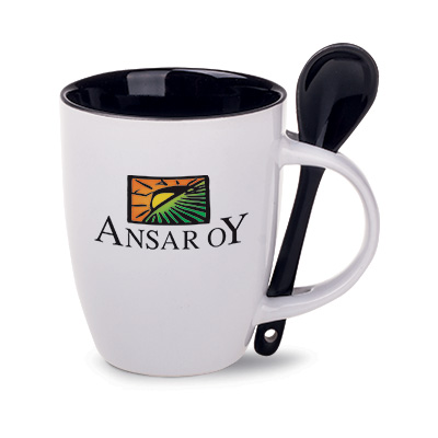 Kubek reklamowy z kolorowym wnętrzem i białym szkliwem na zewnątrz. W zestawie ceramiczna łyżeczka. Unikatowy kształt uchwytu ułatwia przechowywanie łyżeczki.