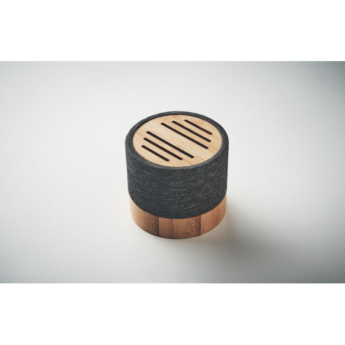 Głośnik bezprzewodowy 5.0 z RPET z bambusowym elementem. Sygnalizacja LED. 1 Akumulator Li-ION 400 mAh. Zawiera port kart SD oraz kabel AUX/USB. Wyjście: 3W, 3 Ohm i 5V. Czas odtwarzania ok. 3h.