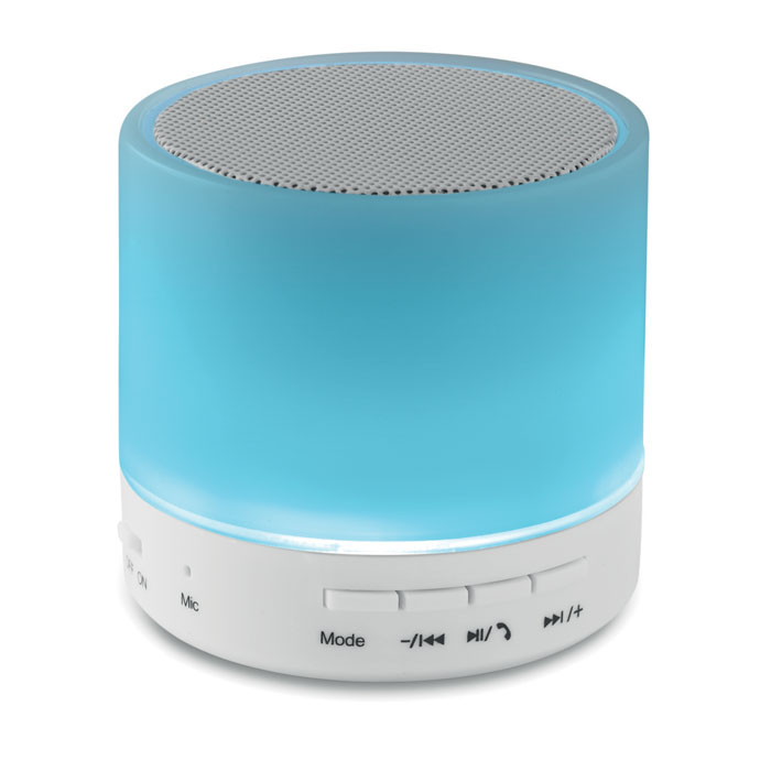 Bezprzewodowy głośnik 2.1 z ABS ze wskaźnikiem LED. 3 zmienne barwy światła. Dołączony 1 akumulator litowy 450 mAh. Zawiera port na karty SD i port do kabli AUX/ USB. Funkcja połączenia hands free. Wyjście: 3W, 4 Ohm. Czas odtwarzania ok. 2h.