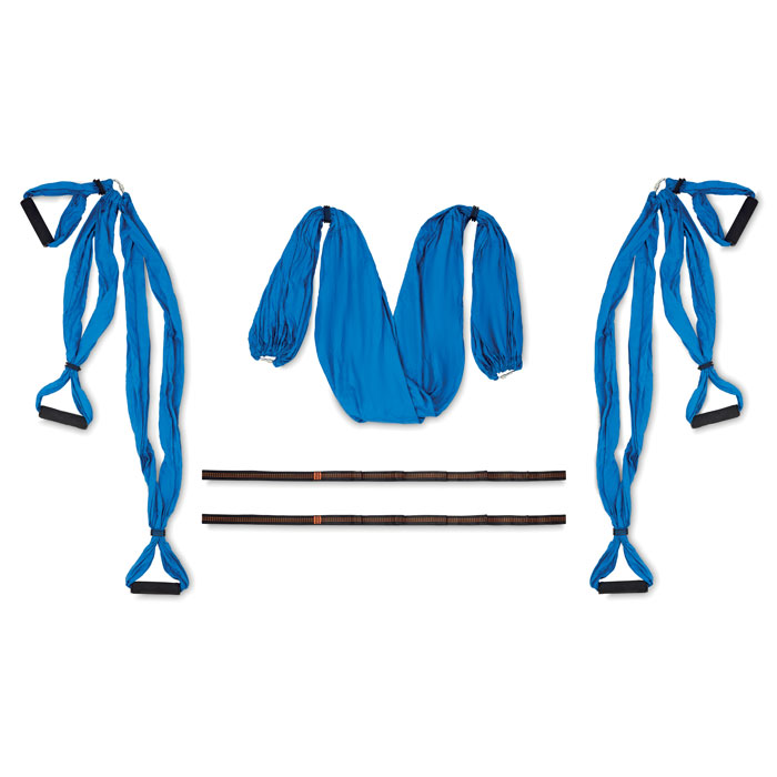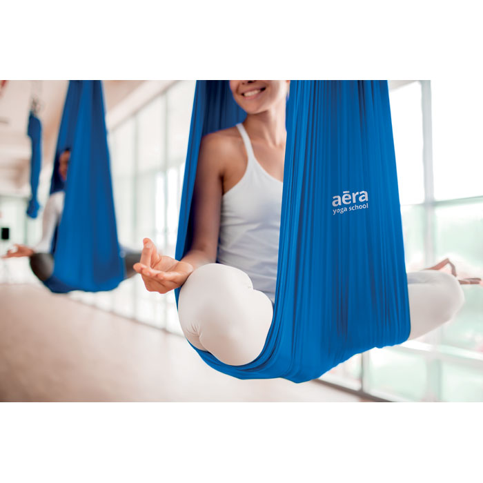 Zestaw z hamakiem do jogi aerial / pilatesu z miękkiego nylonu 210D, stalowymi karabińczykami, pasami przedłużającymi, piankowymi uchwytami, mocowaniem sufitowym i śrubami, w etui. Maks. 200 kg.