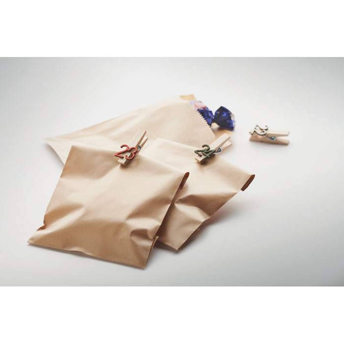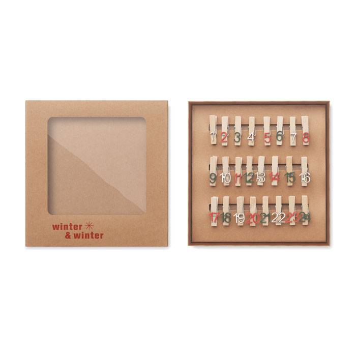 Zestaw 24 drewnianych spinaczy do kalendarza adwentowego. Zapakowany w pudełko z okienkiem z przodu.