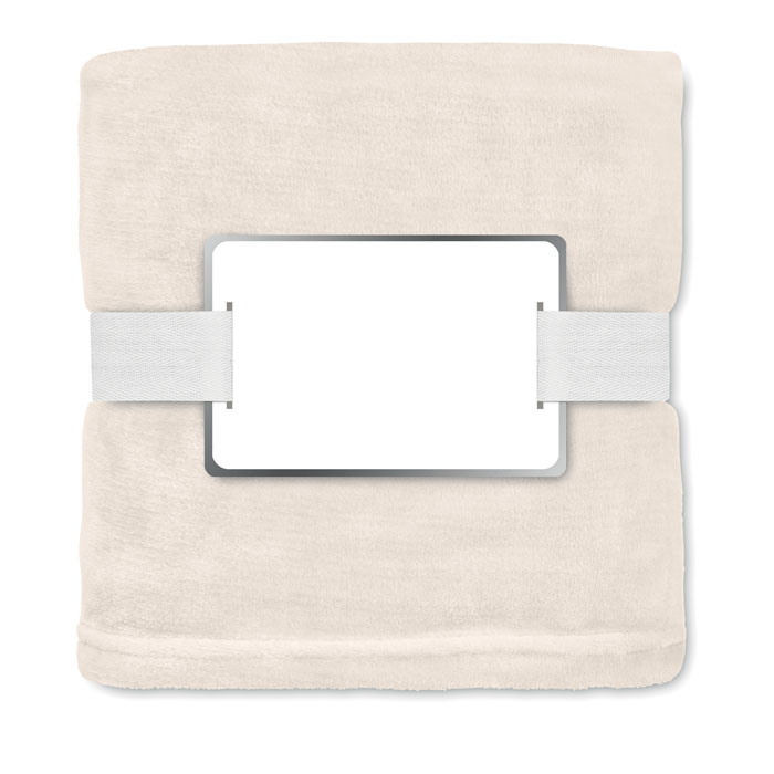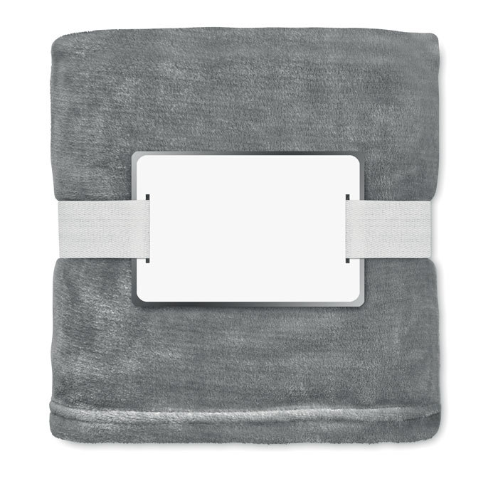 Koc z flaneli RPET 280 gr/m² ze wstążką i etykietą do nadruku.