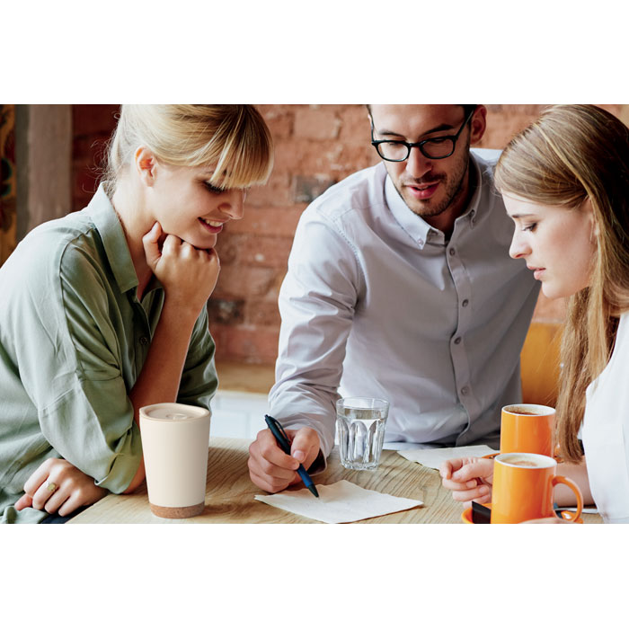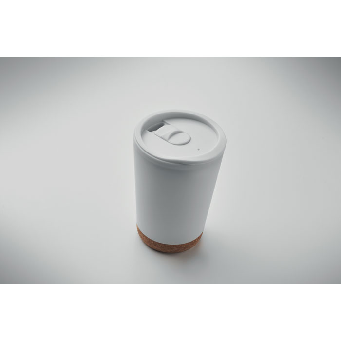 Kubek o podwójnych ściankach z PP z korkową podstawą i zamykaną pokrywką z ustnikiem z PS i ABS. Pojemność: 300 ml.