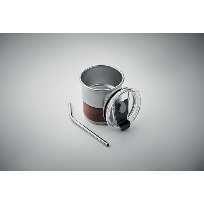 Jednościenny kubek z recyklingowanej stali nierdzewnej (90% stali nierdzewnej z recyklingu i 10% stali nierdzewnej) z odłączanym uchwytem z drewna akacjowego i słomką ze stali nierdzewnej. Szczelna pokrywka z otworem na słomkę i otworem do picia. Pojemność: 260 ml.