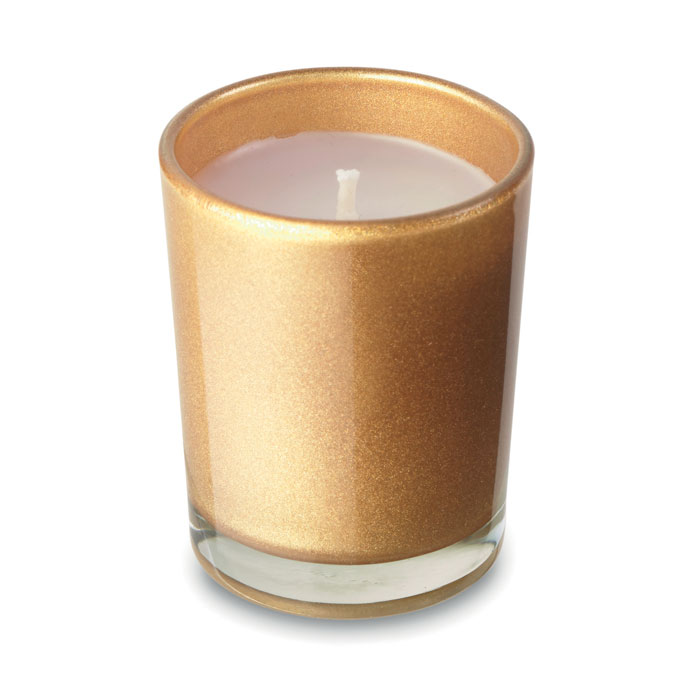 Zapachowa mała świeca w barwionym szklanym pojemniku.
