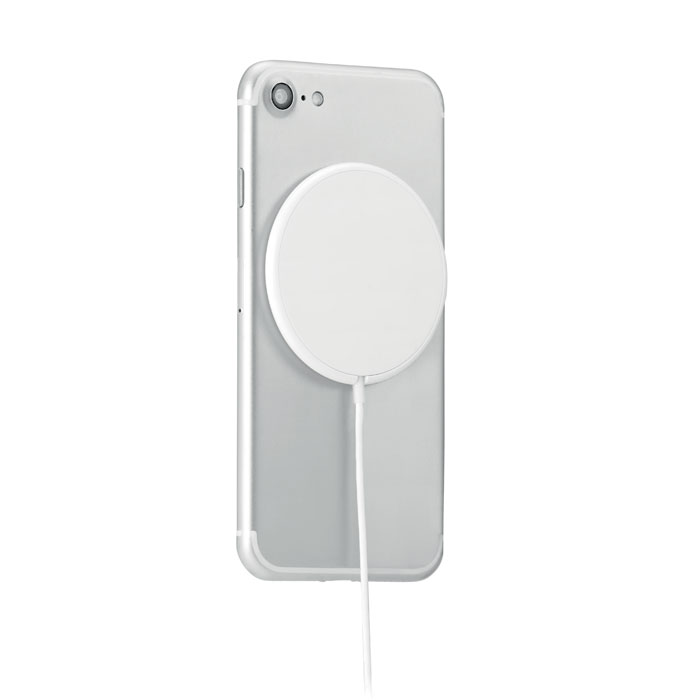 Magnetyczna ładowarka bezprzewodowa z ABS. Wyjście: DC 9V/1.1A (10W) do szybkiego ładowania. Kompatybilna z iPhone ® 12 i nowszymi modelami. W tym dodatkowo magnetyczny metalowy pierścień do ładowania innych niemagnetycznych telefonów z możliwością bezprzewodowego ładowania.