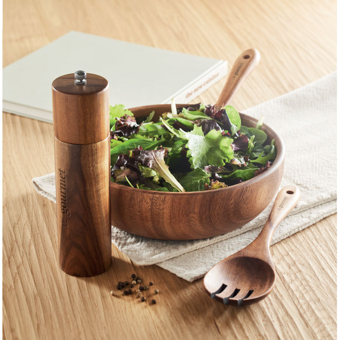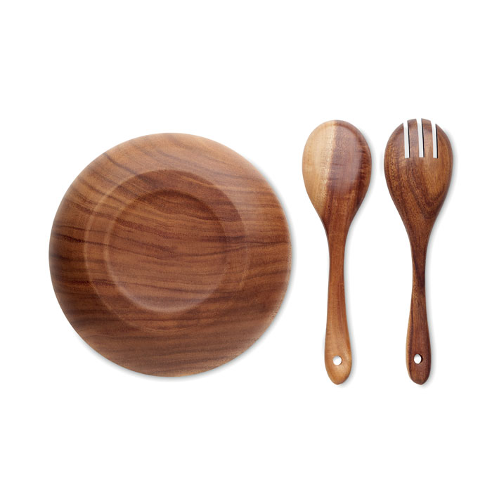 Miska z drewna akacjowego z dwoma łyżkami do sałaty. Średnica: 23
