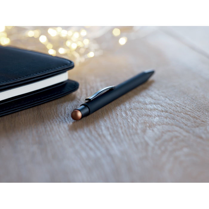 Długopis z końcówką do ekranów dotykowych, wciskany. Pod wierzchnią warstwą obudowy znajduje sie kolorowa warstwa, która staje się widoczna po wygrawerowaniu logo i jest kolorystycznie dopasowana do końcówki długopisu. Niebieski wkład.