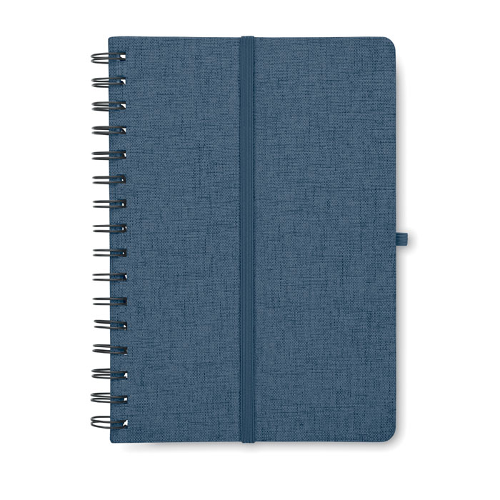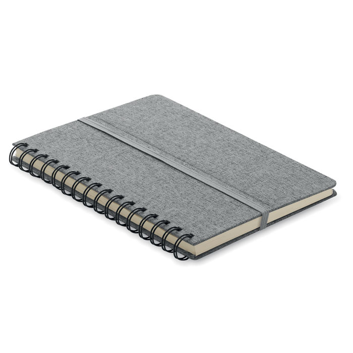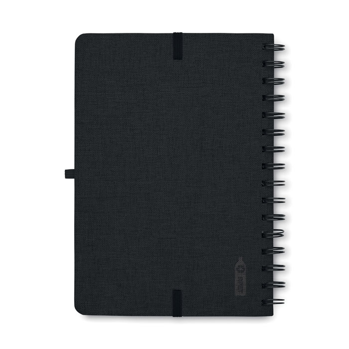 Notatnik A5 z twardą okładką 600D RPET z funkcją podstawki na smartfon. Podwójny splot. 160 stron w linie (80 arkuszy). papier z recyklingu o gramaturze 70 g/m². Elastyczny pasek zamykający.
