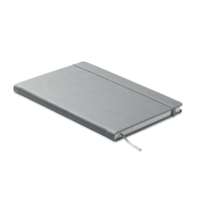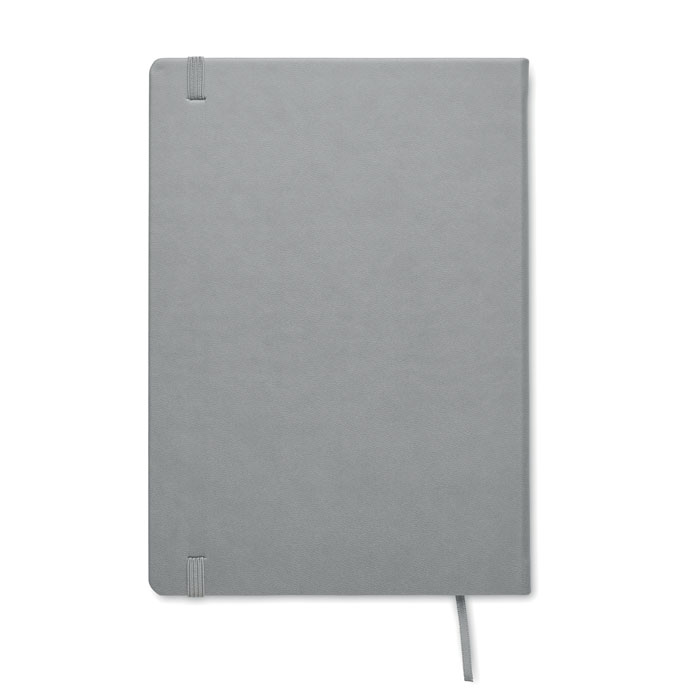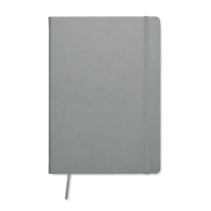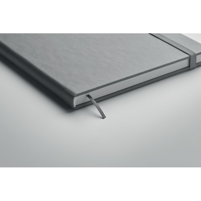 Notatnik A5 z twardą okładką z PU. 192 strony w linie (96 kartek) z papieru z recyklingu (80 g/m²). Dopasowana gumka zamykająca i tasiemka do zaznaczania stron. Wyprodukowano w UE.