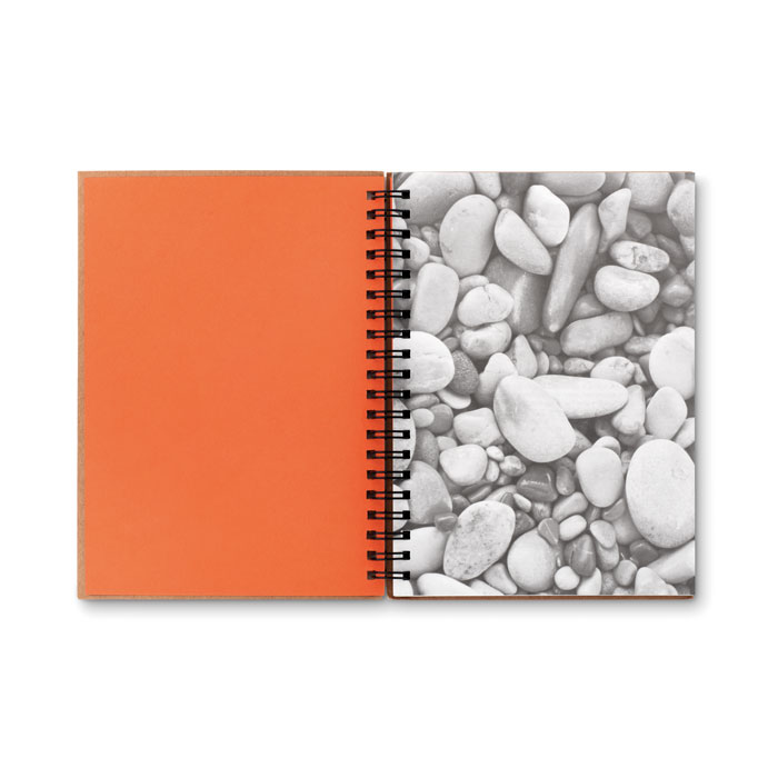 Okładka z kartonu pochodzącego z recyklingu. Podwójna spirala. 140 stron w linie z papieru kamiennego (70 kartek). Papier kamienny jest wykonany z wapienia (węglanu wapnia) i HDPE (żywicy polietylenowej) stosowanej jako spoiwo. Jest wodoodporny i odporny na działanie tłuszczów.