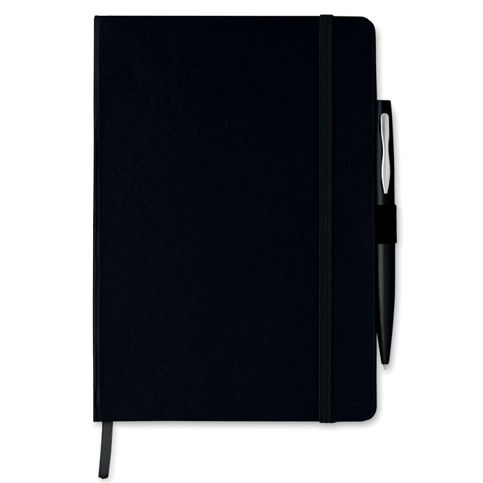 Notes A5 z długopisem. Twarda okładka z PU. 144 strony w linie (72 arkusze). Dopasowany elastyczny pasek zamykający i uchwyt na długopis. Dopasowany metalowy długopis z przyciskiem. Niebieski tusz.