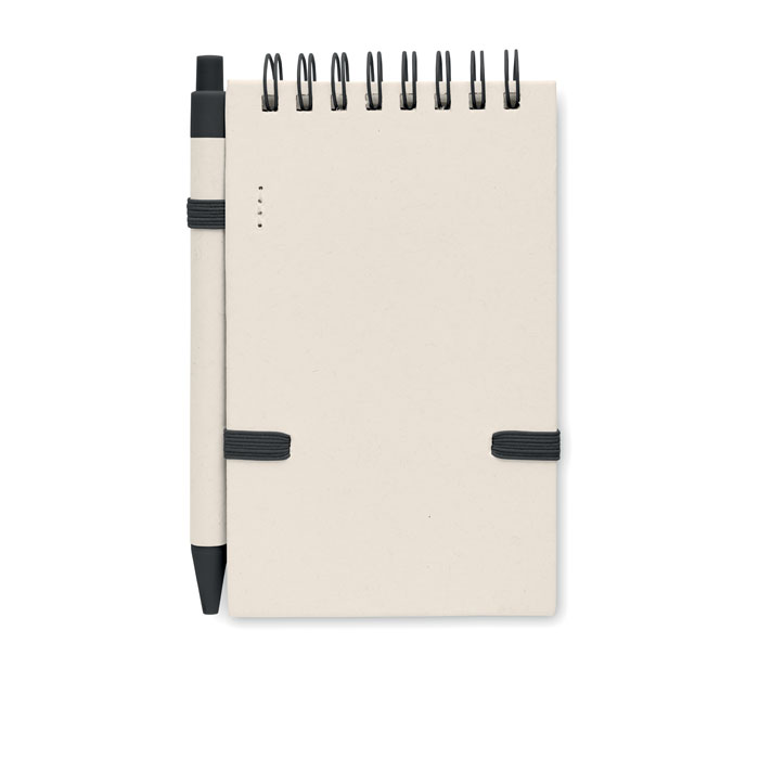 Notes A6 z przetworzonego kartonu po mleku (70% karton po mleku z recyklingu, 30% papier z recyklingu). 70 kartek, dopasowany długopis z przyciskiem z niebieskim tuszem i gumka zamykająca.