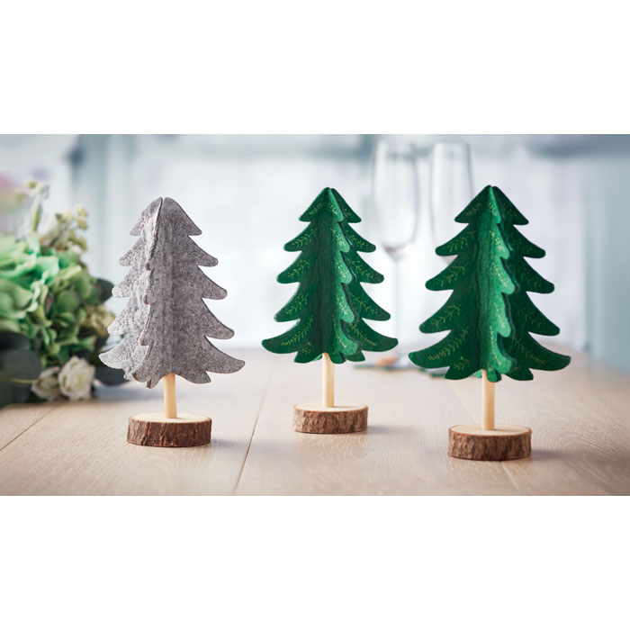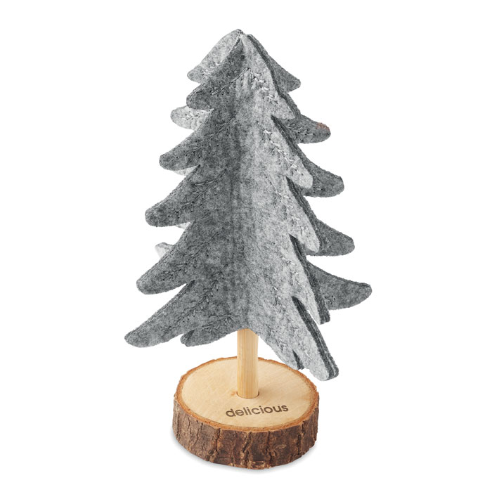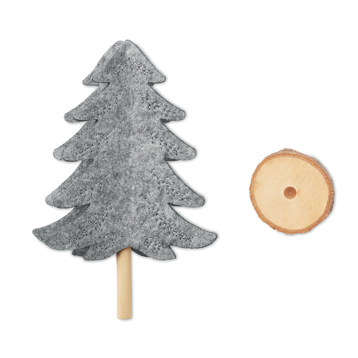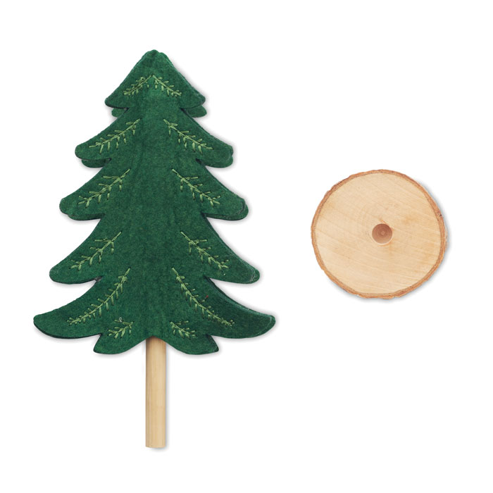 Ozdoba z filcu w kształcie drzewa z drewnianą podstawką.