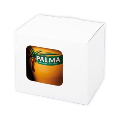 Opakowanie z okienkiem eksponującym nadruk na kubku od strony pijącego praworęcznego.
