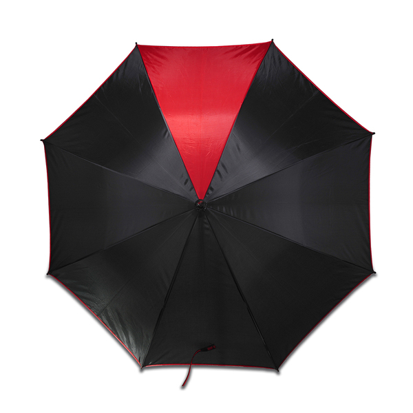 Czarny parasol z poliestru 190 T z kontrastującym czerwonym obszyciem i panelem. Wyposażony w ergonomiczną plastikową rączkę. Rama i żebra wykonane z metalu. Średnica 1060 mm.