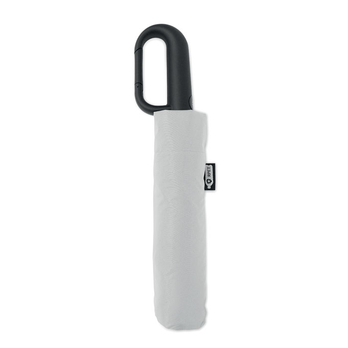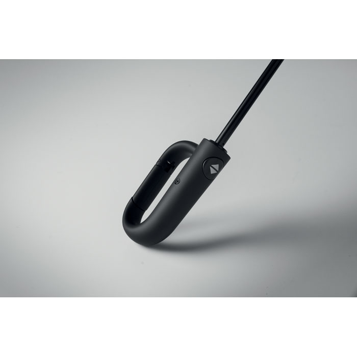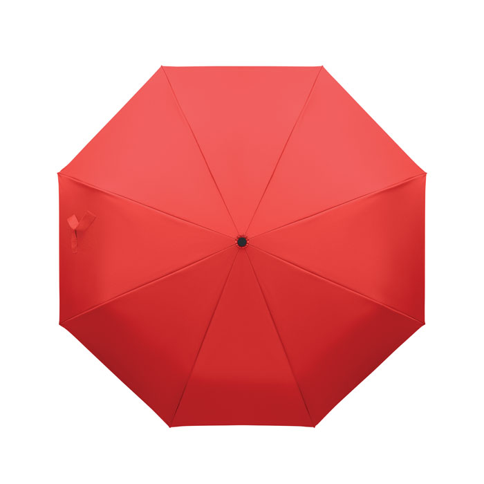 Składany 21-calowy wiatroodporny parasol z pełną czarną ramą z włókna szklanego z 2 sekcjami. Żebra z włókna szklanego. Panele pongee 190T RPET. Uchwyt w kształcie litery D z gumowym wykończeniem. Automatyczne otwieranie i zamykanie. W zestawie pokrowiec.