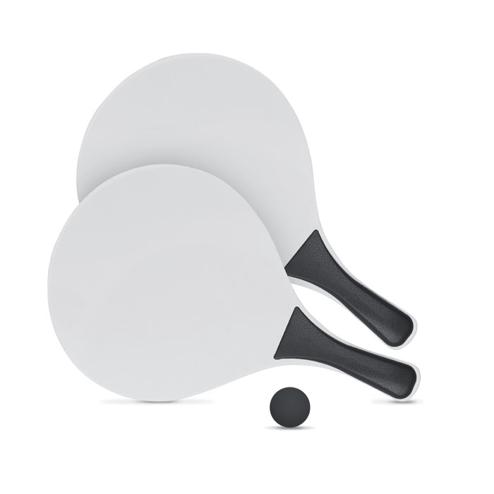 Plażowy komplet tenisowy: 2 rakietki z MDF i 1 miękka piłka.