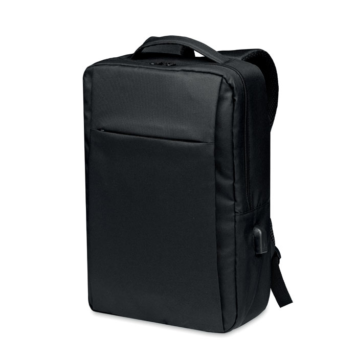 Plecak na komputer z poliestru 300D RPET z wyściełanym paskiem na ramię, zawiera jedną główną komorę wewnętrzną na laptopa 13 cali i kabel USB do ładowania.