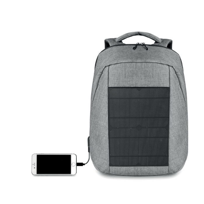 Plecak z poliestru 600D z wbudowaną ładowarką solarną, z portem USB i kablem. Czas ładowania ok. 5-6h. 2 główne przegrody. Przegroda na laptop 13'', wyściełane paski na ramiona oraz plecy oraz dodatkową kieszeń na tablet.