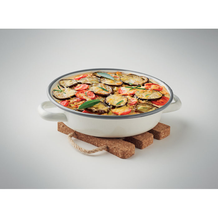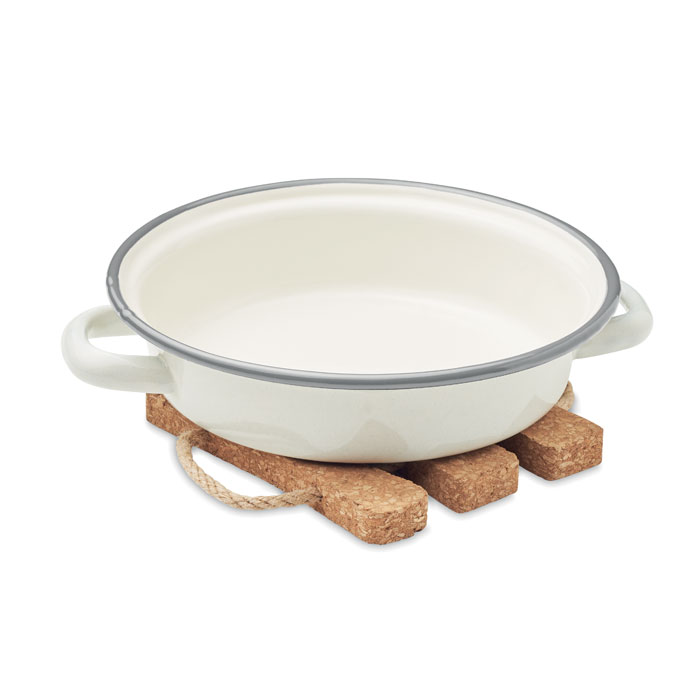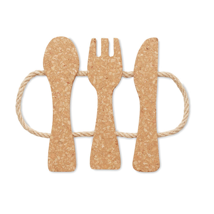 Korkowa podstawka pod naczynia w kształcie sztućców z jutowym sznurkiem. Idealna do wykorzystania w kuchni lub jadalni. Utrzyma Twoje gorące naczynia w bezpiecznej odległości od kuchennych blatów i stołu. Można ją powiesić na jutowym sznurku, gdy nie jest wykorzystywana.