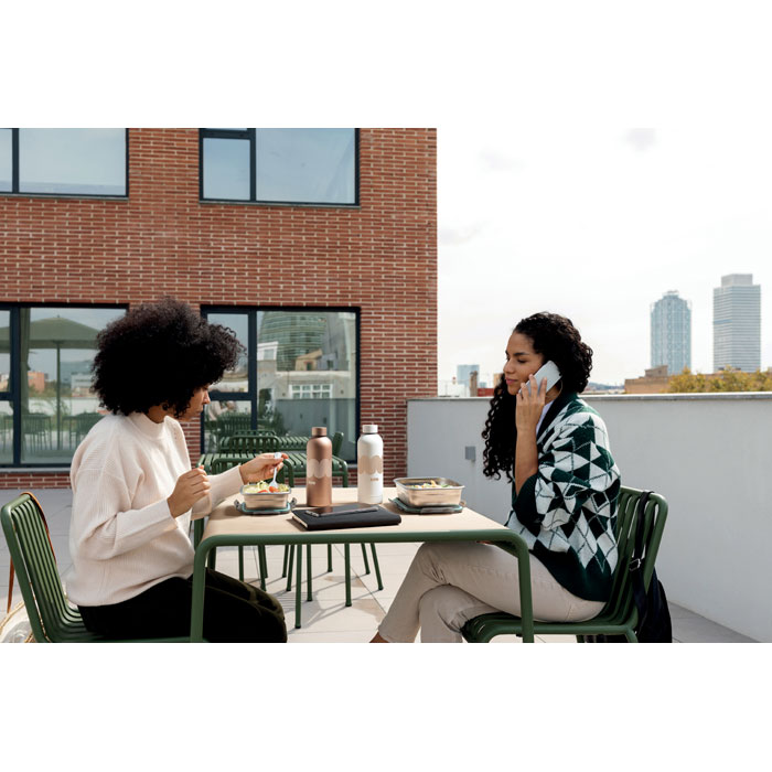 Pojemnik na lunch z recyklingowanej stali nierdzewnej z pokrywką z recyklingowanego PP i 4-stronnym zapięciem. Pojemność: 850 ml.